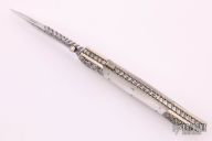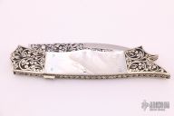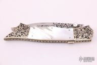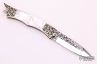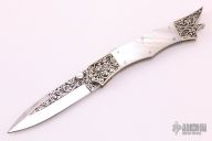 This is a wonderful sole authorship piece from legendary maker Harvey Otis McBurnette features a mirror polished blade with engraved flats, fileworked blade spine and a checkered nickel silver thumbstud. The handle has engraved and dovetailed nickel silver bolsters, mother of pearl scales, fileworked nickel silver liners, and a fileworked stainless steel backspace with fileworked brass liners. Excellent condition. Comes with a zippered case.