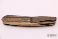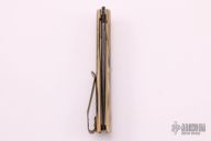 This T Arc Front Flipper by Brad Zinker features a Vegas Forge Damascus blade with checkered thumbrest and flipper. The handle has mammoth ivory scales, anodized titanium liners with laser engraved interiors and a tip up anodized titanium clip. Rides on bearings, nice detent, lockup and blade seating. Comes with zippered case. New from maker!