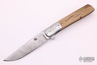This Urban Trapper Flipper by Brad Zinker features a Damasteel blade with checkered thumbrest and flipper. The handle has dovetailed Damasteel bolsters, mammoth ivory scales, anodized titanium liners with laser engraved interiors and a tip up anodized titanium clip. Rides on bearings, nice detent, lockup and blade seating. Comes with zippered case. New from maker!