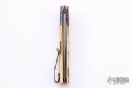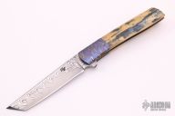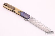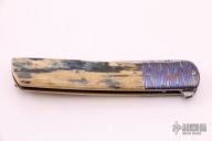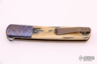 This Urban Trapper Flipper by Brad Zinker features a Damacore blade with checkered thumbrest and flipper. The handle has dovetailed Mokuti bolsters, mammoth ivory scales, anodized  titanium liners with laser engraved interiors and a tip up anodized titanium clip. Rides on bearings, nice detent, lockup and blade seating. Comes with zippered case. New from maker.