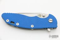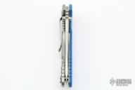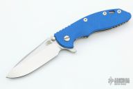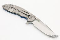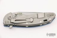 This XM-18 Flipper by Rick Hinderer Knives features a 3.5" stonewashed finished blade, notched thumbrest and flipper, dual thumbstuds. The handle has a blue G-10 scale, and stonewashed titanium handle/clip. Clip can be mounted for tip up or down carry. Nice lockup, seating, and detent. Comes with original box and extra hardware. New condition.