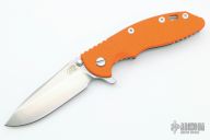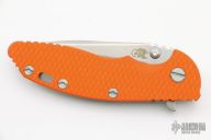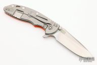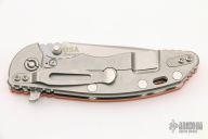 This XM-18 Flipper by Rick Hinderer Knives features a 3.5" stonewashed finished blade, notched thumbrest and flipper, dual thumbstuds. The handle has a orange G-10 scale, and stonewashed titanium handle/clip. Clip can be mounted for tip up or down carry. Nice lockup, seating, and detent. Comes with original box and extra hardware. New condition.
