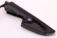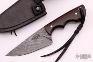 This Damascus Utility by Patrick Teyke features a Damascus blade with .154" blade stock and 1.233" blade depth, full tang construction. The handle has desert ironwood scales with stainless steel pins and lanyard hole. Comes with a black leather sheath. Excellent condition.