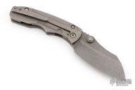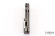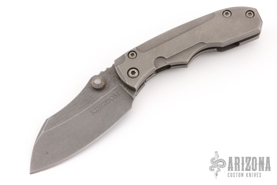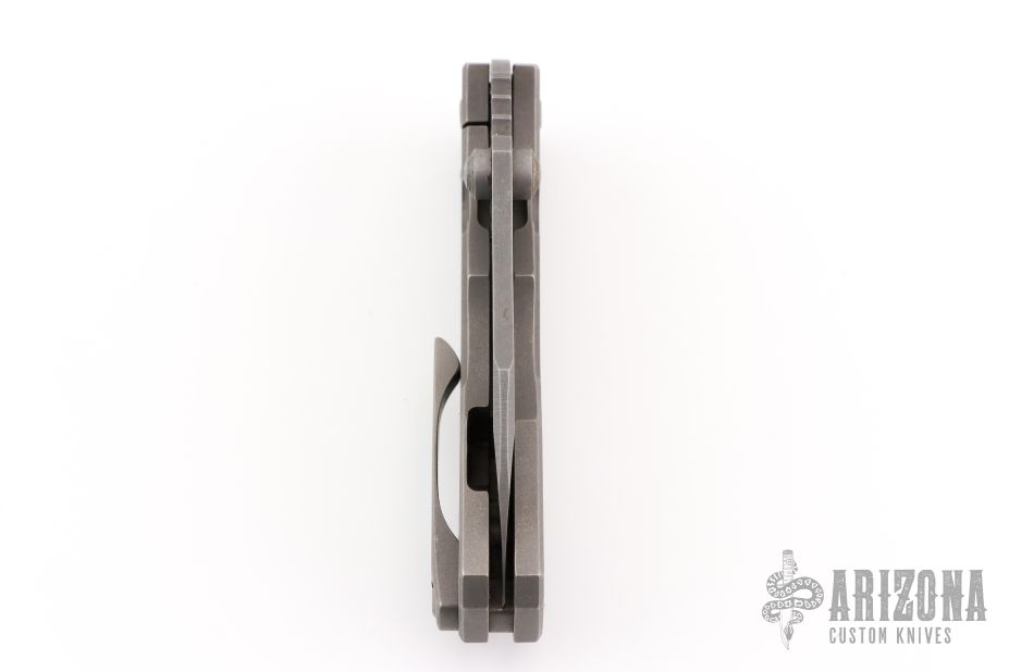 This Hawthorne Prototype by Kingdom Armory features a tumble finished clip point blade with swedge, notched thumb rest and dual thumbstuds. The handle is comprised of machined titanium over titanium backspacer. Machined titanium tip up clip is positioned for right hand, tip-up carry. Has some scuffs and scratches, two dings in the blade. Good condition.