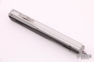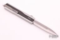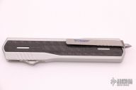 This Night Stalker OTF Auto by No Limit Knives features a satin finished double-edged blade. The handle has a silver aluminum frame with carbon fiber inlays, tip down titanium clip. Comes with a zippered case. New from maker.
