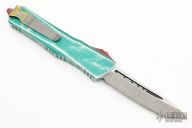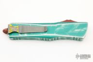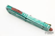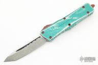 This Combat Troodon by Microtech features an Apocalyptic finished tanto blade. The handle has a distressed green aluminum frame with red hardware and a tip down stainless steel clip. Comes with original box and papers. Dated 10/2020 and s/n 1052. Excellent condition.