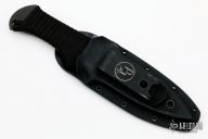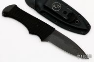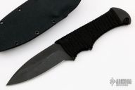 This Blood Shark by Tracker Dan features a black finished blade with non-spiral grind, magnacut steel, .181" blade stock and 1.021" blade depth. The handle has flat black cord wrap with no shroom cap at the tail. Comes with a kydex sheath and the knife will fit in either direction. Excellent condition.