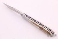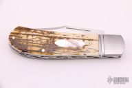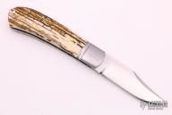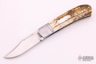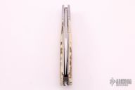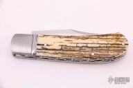 This slipjoint by David R Davis features a hand rub satin finished blade with nail nick. The handle has threaded and fluted stainless steel bolsters, mammoth ivory covers with a mother of pearl escutcheon, fileworked stainless steel liners and spring. Has half-stop, flush in all positions. Comes with a zippered case and COA dated Nov 2021 and #158. New from maker at the 2021 KYCKS.