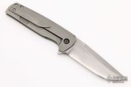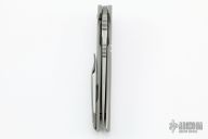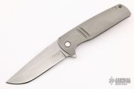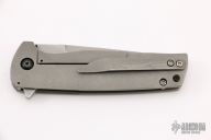 This Ronin from Mr. Curry features a tumble finished blade with notched thumbrest and flipper. The handle is constructed of tumbled titanium with a matching pocket clip is positioned for tip up carry. Blade is centered when closed and locks up with no play. Has some scuffs and scratches, has been resharpened, otherwise good condition. Comes with zippered case and COA.