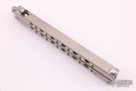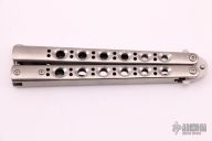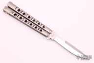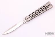 This Model 42 Balisong by Benchmade features a satin finished blade with swedge. The handle is comprised of integral skeletonized titanium handles with T latch on pommel. Excellent condition. Comes with original box, sheath and papers.