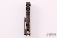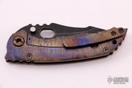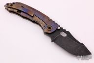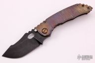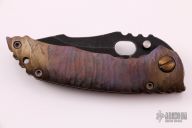 This Framelock from Dalibor Bergam features a black tumble finished blade with notched thumbrest and thumbhole. The handle is comprised of sculpted, heat colored and orange peel finished titanium with a matching pocket clip positioned for tip up carry. The blade is centered when closed, opens/closes smoothly, and locks up with absolutely no play. Has a few light scuffs, otherwise excellent condition. 1 of 11