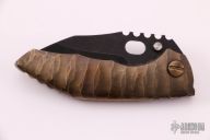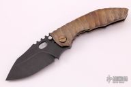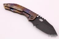 This Draco integral from Dalibor Bergam features a black blade, notched thumbrest and thumbhole. The handle is sculpted and anodized from a single piece of titanium that has then been orange peel finished, matching tip up clip. The blade is centered when closed, opens/closes smoothly, and locks up with absolutely no play. This piece is in excellent condition.