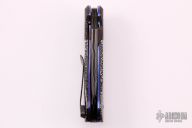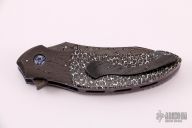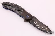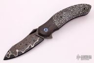 This knife by Peter Martin features a Hot Blued Sole Authorship San Mai Damascus blade with nickel/iron Damascus thumblug and a flipper. The handle has Damascus bolsters, resin impregnated scales, anodized/jeweled titanium liners, matching San Mai Damascus backspacer, and a tip up Damascus clip with hidden screws, anodized titanium pivot and pivot collars. Martin is signed on the inside of the backspacer.  Nice detent, lockup and blade seating. Includes a padded zippered case.  Excellent Condition.