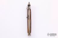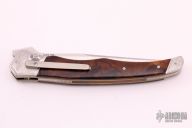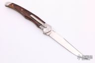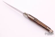 This knife by GH Knives features a hand rub satin finished blade with swedge and notched thumbrest, front flipper style opening, engraved blade spine.  The handle has engraved and fluted 304 stainless steel bolsters with desert ironwood burl scales, anodized titanium liners, engraved stainless steel backspacer with ironwood burl inlay, tip down titanium clip. Has a rolling safety mechanism to lock the knife open. Comes with wooden box and COA. New from maker. Very nice attention to detail. "Canada 2020" inside backspacer.
