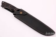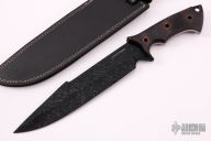 This Fighter by RCF Combat features a black powder coated blade, .239" blade stock and 1.838" blade depth, full tang construction. The handle has black canvas micarta scales with tube pins. Comes with a black leather sheath and COA dated 7/30/2019. New from maker. Has a little rust on the tube pins. Would make a good user.