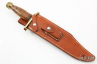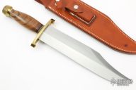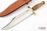 This Model 12-11 Smithsonian Bowie by Randall Made Knives features a satin finished carbon steel blade with sharpened top edge, .317" blade stock and 2.270" blade depth, hidden tang construction. The handle has a lugged brass guard, fileworked brass butt and collar with a walnut grip. Comes with a brown leather rough back butterfly stitched sheath. Excellent condition. Vintage, Mid- eighties.