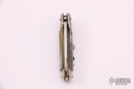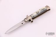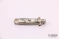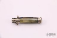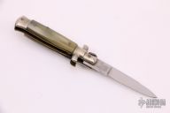 This 4.5" Swivel Bolster auto by Wandy INOX of Italy, it features a mirror polished and flat ground blade. The handle has nickel silver bolsters, front and rear, buffalo horn scales, D-stamped brass liners, stainless spring. Has some light scratches, otherwise excellent condition.