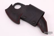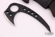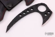 The Magnumworks Black Hellfire Silat Mini Axe is a modern take on a ancient Javanese weapon called the “Kapak Kecil “ which dates back to the 15th century. Originally a small farming axe that became weaponized through changes to the handle and shape of the axe blade. Magnumworks took the aspects of a small axe and combined them with a karambit style platform. Having close quarter confrontation in mind, this is a weapon primarily designed for the bladed martial arts and in field combatives. The smaller size allows for ease of wielding in close quarters. The axe blade and the spike are both sharpened, and are protected by a leather sheath which can be carried by a belt loop. Excellent condition.