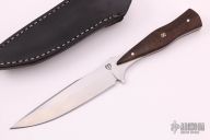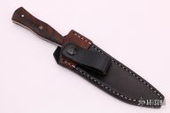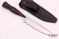 This knife by Biegler Blades features a drop point blade with satin finish and false top edge, .127" blade stock and 1.066" blade depth, full tang construction. The handle has desert ironwood wood scales with black liners and mosaic and stainless steel pins. Comes with a black leather sheath. Excellent condition.