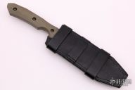 This knife by Biegler Blades features a clip point blade with a dark tumble finish and false top edge, .154" blade stock and 1.474" blade depth, full tang construction. The handle has green G-10 scales. Comes with a black leather sheath. Excellent condition.