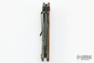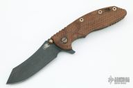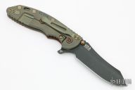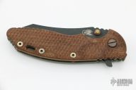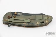 This Hinderer XM-18 3.5" Vintage Series model features a black coated O1 steel blade and a Smooth walnut wood handle with a green/bronze titanium frame. The Rick Hinderer XM-18 3.5" Vintage is a remarkable version of the famous Hinderer XM18. For this special version Hinderer became inspired by his love for firearms. The wood that is used for the handle of weapons, combined with the classic tool steel for the blade. A Vintage edition of an incredibly modern pocket knife. A top-quality work knife. The finish is simply perfect; grip wherever you might need it and curved wherever possible. As such it feels amazing in hand. When opened the flipper will keep your hands away from the edge. As such you never have to worry about slipping during the more demanding cutting tasks. The skinner blade is made from O1 tool steel. Not stainless, but tough and easy to sharpen. With the right heat treatment it is a great type of steel to work with. In between the flipper and the edge you can find a finger choil. With it you have more control over the blade during the more detailed tasks. The stunning finish on the blade is striking. After all, the stonewashed finish has been enhanced with irregular and shiny highlights. These ensure that traces of use are hardly noticeable. In addition, it looks amazing! You easily open the XM18 with the (double) thumb studs, or with the flipper. With a small wrist movement you can easily open the blade. The knife has been enhanced with ball bearings which make sure the knife moves smoothly. However, it also comes with teflon and phosphor bronze washers. This is the Hinderer Tri-Way pivot system. When opened a solid framelock neatly keeps the blade in place. A characterizing detail here is the lockbar stabilizer. This is a round disc on the side of the titanium handle. It ensures that you cannot overstretch the lock. In addition, these Gen6 edition has been enhanced with a steel lockbar insert. You can always carry the XM-18 with you with the titanium pocket clip. This tip-down pocket clip is mounted to the right side, but with the Philips screwdriver you can easily turn it into a tip-up pocket clip. This Vintage edition is enhanced with a unique serial number, starting with a V. This one is V1334. Comes with original box and extra hardware. Excellent condition.