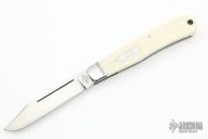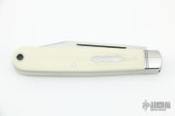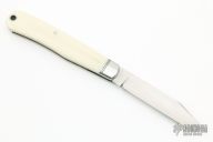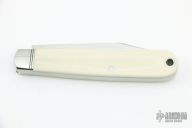 This slipjoint from T.A. Davison features a hand rub satin finished blade with nail nick. The handle features white G-10 covers with stainless bolsters over stainless liners, a stainless steel scutcheon, and spring. Spring is flush in the closed, half stop, and open position. Nice blade seating and function. Excellent condition. Comes with zippered case.