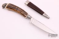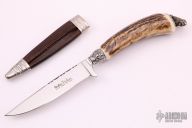 This Knicker by Linder features a mirror finished blade with a fileworked spine, .175" blade stock and .790" blade depth, hidden tang construction. The handle features a cast nickel silver collar and butt with a wild boar, stag grip. This knife includes a black leather and stainless steel scabbard and the original box. Excellent Condition.