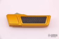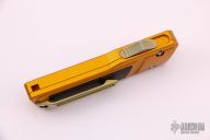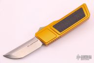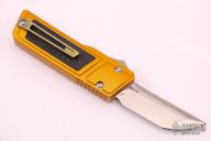 This Akuma OTF Auto by No Limit Knives features a satin finished tanto blade. The handle has a gold aluminum frame with carbon fiber inlays and a steel pocket clip. Comes with a zippered case. New from maker.