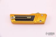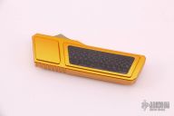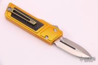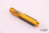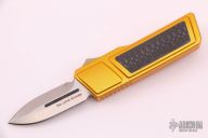 This Akuma OTF Auto by No Limit Knives features a satin finished double-edged blade with carbon fiber inlays. The handle has a gold aluminum frame with carbon fiber inlay sand a steel pocket clip. Comes with a zippered case. New from maker.