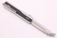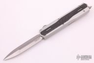 This Night Stalker OTF Auto by No Limit Knives features a satin finished double-edged blade. The handle has a silver aluminum frame with carbon fiber inlays and a steel pocket clip. Comes with a zippered case. New from maker.