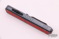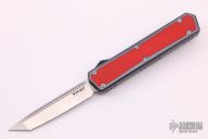 This Vanga OTF Auto by No Limit Knives features a satin finished tanto style blade. The handle has an anodized aluminum frame with a red G10 inlay, tip down steel clip. Comes with a zippered case. New from maker.