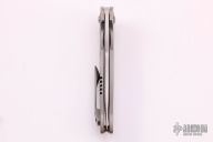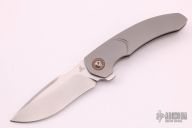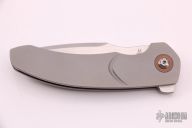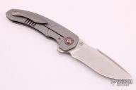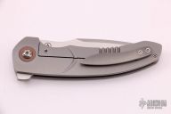 Designed by Walter Randolph and made by Alliance Designs this Deimos features a bead blasted blade with satin finished flats.  The handle features a titanium frame with a matching tip up pocket clip and copper pivot collars. Nice detent, lock up, and blade seating. New from Maker.