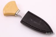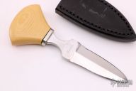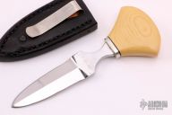 This Push Dagger by Ralph Combs, features a mirror polished double edged blade with .172" blade stock and .919" blade depth, hidden tang construction. The handle has a nickel silver guard, yellow paper micarta grip and a black spacer. Comes with a black leather sheath with clip. "9-76-192" is scribed on the ricasso. I'm going to guess it was made "9-76" and is his (or her) 192nd knife. Looks to have been resharpened, otherwise good condition.