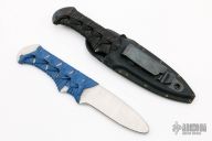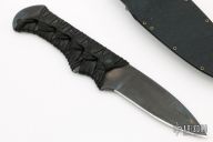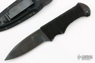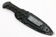 This Blood Shark by Tracker Dan features a black finished blade with a false top edge, .143" blade stock and .975" blade depth. The handle has a single ridge wrapped black cord wrap. Comes with a kydex sheath and the knife will fit in either direction. Has a few scuffs, otherwise excellent condition. Comes with trainer. This knife was originally purchased in March of 2014. Has old style sheath and clip with small rivets.