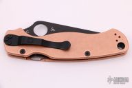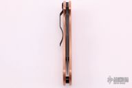 This Paramilitary 2 Linerlock Folder has a black clip point REX45 blade with thumb hole and notched thumb rest. Handle is tumbled copper with stainless steel liners and stainless steel 4-way reversible clip. Excellent condition. Comes with original box and papers.
