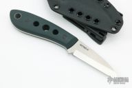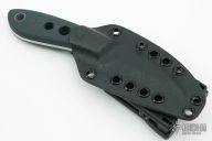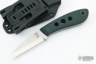This Bushcraft Utility from Tom Krein features a satin finished blade with scandi grind, .135" blade stock and .855" blade depth, full tang construction. The handle has forest green G-10  scales with black linen micarta pins and a lanyard tube, black liners. Includes a kydex sheath with TekLok. New from maker!