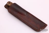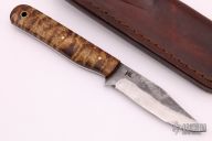 This Hunter by ML Knives features a satin finished clip point blade with hammer marked flats, .110" blade stock and .904" blade depth, full tang construction. The handle has curly maple scales and brass pins. Comes with a brown leather sheath. Excellent condition.