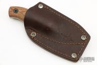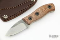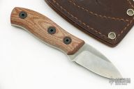This Production Runt by Fiddleback Forge features a stonewashed drop point blade, .125" blade stock and .939" blade depth, full tang construction. The handle has natural canvas micarta scales. Comes with brown leather sheath. Excellent condition.