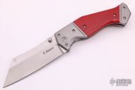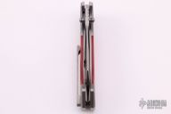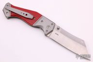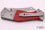 This Jekel Butcher linerlock Flipper by Randy Doucette has a satin finished blade with false top edge and fileworked thumbrest, dual thumbstuds. The handle has fluted and bead blasted titanium bolsters, front and rear, red G-10 scales, bead blasted titanium liners and a tip up clip. Nice detent, lockup and blade seating. Has a few scuffs/scratches, otherwise excellent condition.