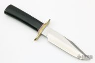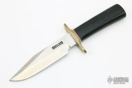 This Model 15-5.5 Airman by Randall Made Knives features a satin finished clip point blade with sharpened top edge, .223" blade stock and 1.307" blade depth, hidden tang construction. The handle has a brass guard and black linen micarta grip.  Includes brown leather sheath with belt loop and sharpening stone.  Excellent Condition.