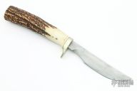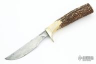 This custom hunter by Mark Waldrop features a Damascus blade with .146" blade stock and .815" blade depth, hidden tang construction. The handle has a nickel silver guard with a stag grip.  Oxidation is visible on the blade.  Scratches are visible on the blade and handle.