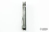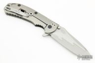 This 0560CBCF frame-lock flipper features a drop point blade with notched thumb-rest, dual thumb-studs and flipper. This one features a zigzag-patterned Composite Blade with a cutting edge of S110V and a spine of 14C28N. The handle features a carbon fiber scale with stainless steel liner and a textured titanium scale on the opposite side. Tip up stainless steel clip, 4-way reversible. Serial # 0834. Excellent condition. Comes with original box and papers.