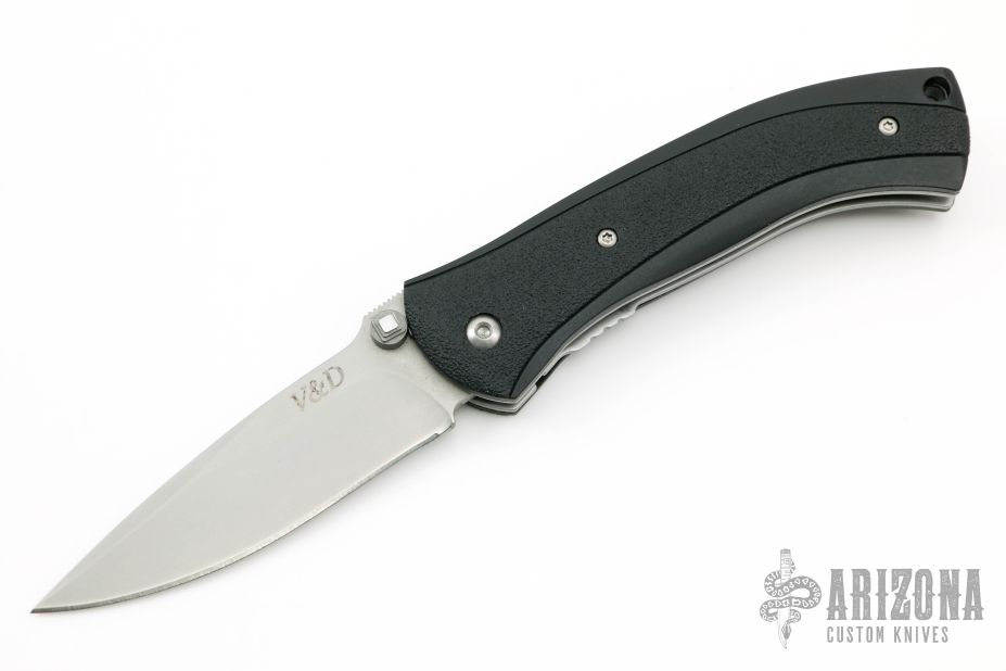 This Scale Release Automatic from V&D Knives (Butch Vallotton and Matt Diskin) features a satin finished spear point blade with swedge, dual thumb studs and notched thumb rest. The handle is comprised of black polymer scales over steel liners and black polymer backspacer. Lanyard hole in pommel. Stainless steel tip up clip and lanyard hole in pommel. Includes original box. Has a couple light scuffs, otherwise excellent condition.