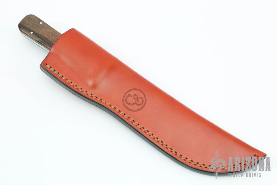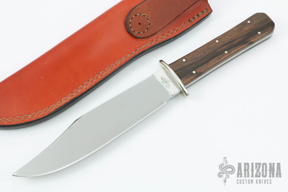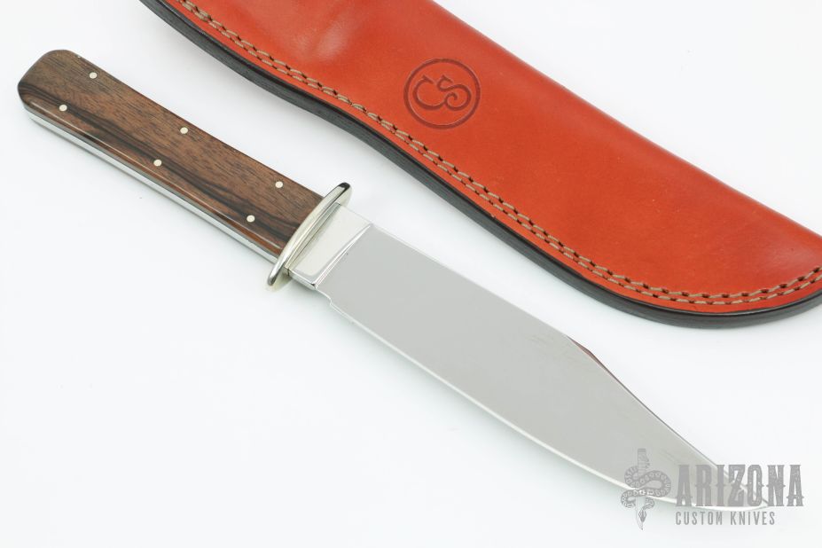 This 1873 Bowie by Canal Street Cutlery features a mirror polished clip point blade with false top edge, .176" blade stock and 1.463" blade depth, full tang construction. The handle has a nickel silver guard, wood scales and nickel silver pins. Comes with a brown leather sheath, original box and papers. Excellent condition. #030 on the guard. Made in 2008