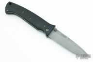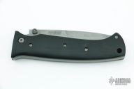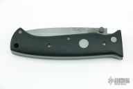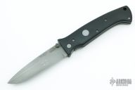 This 1994 Soldier of Fortune Knife by Butch, Rainy and Shawn Vallotton features a bead blasted spear point blade with dual thumbstuds and false top edge. The handle has black linen micarta scales, bead blasted titanium liners and bead blasted stainless steel backspacer. Nice detent, lockup and blade seating. SOF-94 #10 on blade. Has some light scuffs on the bead blast finishes, otherwise excellent condition. Comes with a velcro Bill's Case long enough to store open.