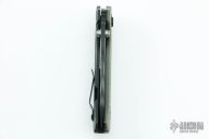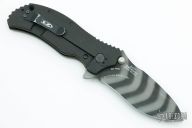 This 0301 frame-lock assisted flipper by Zero Tolerance features a recurve spear-point blade with a tiger stripe finish, stainless steel liner green G10 scale, and black titanium scale with a black G-10 back-spacer. It also features the Speed-safe assisted opening system. Tumble finished black stainless steel clip and lock bar stabilizer. Clip is 4-way reversible. S/N 19764. Has some scuffs and scratches, otherwise good condition. Comes with original box and papers.