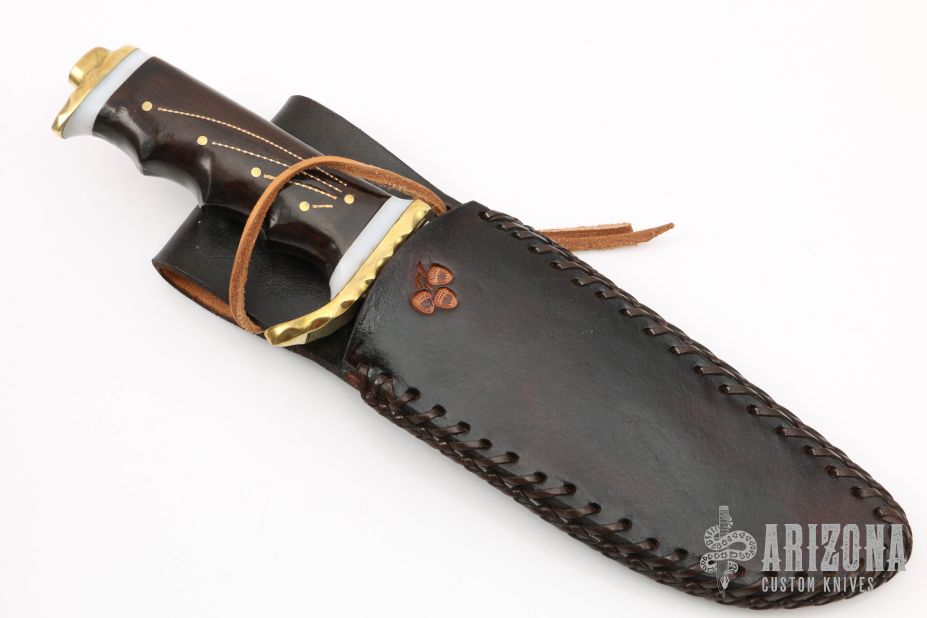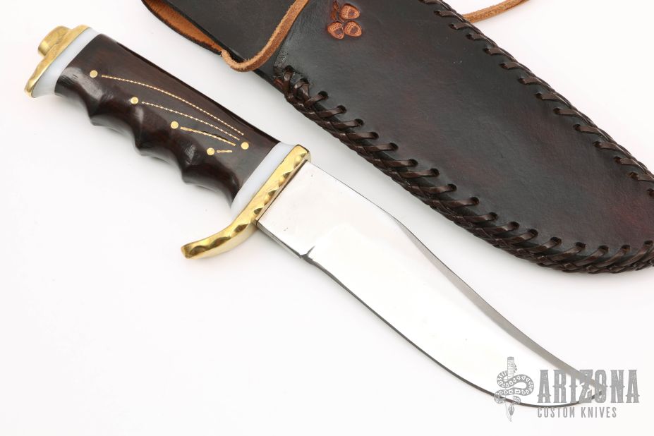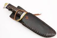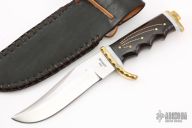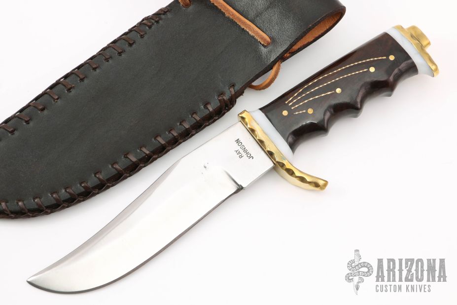 This Custom Bowie by Ray Johnson features a satin finished blade with false top edge, .213" blade stock and 1.505" blade depth, hidden tang construction. The handle has a fileworked brass guard and butt, dark wood grip with brass pins and twisted wire accents, white corian spacers. Comes with a black leather sheath. Has a few light scratches, otherwise excellent condition.