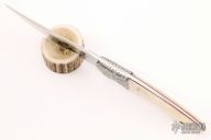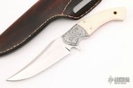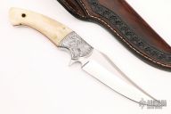 This Clip Point Hunter by Shawn Smith features a mirror polished blade with .164" blade stock and 1.396" blade depth, full tapered tang construction. The handle has engraved stainless steel bolsters, bone scales with red spacers/liners, engraved tang spine. Comes with a brown leather sheath and a hand carved wooden display box with brass latch. New from maker.