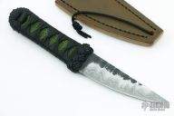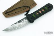 This Aikuchi from Ben Tendick of B.R.T. Bladeworks features a hand rub satin finished San Mai Damascus (410ss and 1095 core) blade with forge finished flats, .172" Blade stock 1.065" Blade Depth. The handle has a black Tsuka Ito wrap over green stingray skin and a hammered copper menuki. Includes a brown leather sheath and C.O.A. dated 11-29-21. New condition.