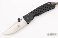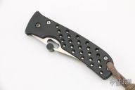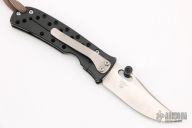 This Buck/Mayo Waimea Framelock Folder collaboration has a satin finished clip point blade with thumb hole, has an aftermarket thumbstud that can be removed. Paul Bos heat treated blade. Frame is black titanium with milled holes, bead blasted titanium tip down clip, and lanyard hole. Has a few light scuffs and a little wear on the edges of the frame, otherwise good condition.